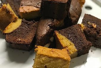 Vertemos la mezcla del brownie de chocolate en un molde y encima de la mezcla de chocolate agregamos la mezcla de calabaza y queso. La podemos dejar así y nos quedaran 2 capas o mezclarlo suavemente y nos quedara atrigado.