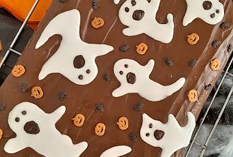 Para el día de Halloween de este año, además de las galletitas retales de Sally y unas cookies inspiradas en Stranger Things de las que ya os hablaré, me decidí por un brownie, pero uno muy especial. Es un brownie clásico americano con castañas asadas en el horno en lugar de nueces. Aprovechamos la temporada y le damos un toque muy nuestro. Queda jugoso y la textura del chocolate fundente es delicioso con el sabor a castañas. Lo cubrimos con chocolate y decoramos con fantasmitas de glasa y sprinkles. Hay muchos fantasmas rondando en el vecindario. ¿Me ayudas a encontrarlos? Cuidado porque quizás no sea alguien con sólo con una sábana...¿Te apuntas? ¿Truco o trato?👻