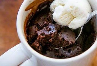 1/4 taza (50 g) de harina 1/4 taza (70 g)de azúcar 2 cucharadas (13 g) de cacao (natural, sin azúcar)Una pizca de salPizca de canela molida1/4 taza (60 ml)de agua 2 cucharadas de aceite de canola o aceite vegetal 1 a 2 gotas de extracto de vainilla1 pequeña bola de helado o 1 o 2 cucharaditas de crema de leche para servir