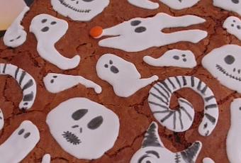 Para la glasa, batimos ligeramente la clara y, cuando espumee, le agregamos unas gotitas de limón y a continuación el azúcar glass. Poco a poco la iremos integrando hasta obtener un espesor ligero que nos permita decorar nuestro brownie. Llevamos a la manga con la boquilla M 2 de Wilton y decoramos haciendo siluetas y círculos. Complementamos con lacasitos y, pasado un tiempo hasta que la glasa solidifique, terminamos dibujando con lápiz comestible o chocolate. Conservamos en recipiente hermético por varios días o dividimos en bolsitas y a repartir en Haloween ¿Truco o trato?