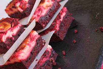 Combina el chocolate rojizo, por el colorante, con la suavidad de la crema de queso. Se prepara en dos fases, por un lado, la base del brownie y por otro la crema de queso.