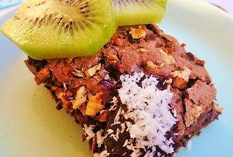 4. Servimos los brownies con un poco crema de cacao vegetal y coco rallado.
