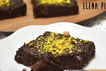 - A continuación, agregamos la harina y el salvado, así como el resto del chocolate troceado. Vertemos en un molde cuadrado de unos 20cm de lado, cubierto con papel vegetal, y horneamos 25 minutos a 175ºC. Dejamos enfriar por completo, y servimos cortado en unas 9 porciones decoradas con frutos secos al gusto (yo me decanté por los pistachos, por el contraste de color).
