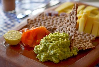 Básicamente se basa en disponer los ingredientes en una tabla o plato así como el pan, que para la ocasión es un pan sueco, tostado, grande y redondo que se va cortando para acompañar una selección de quesos, los que más nos gusten, un poco de embutido, en este caso un fuet español, con salmón ahumado en madera y una cremita de aguacate hecha al momento que sólo lleva este ingrediente, sal, aceite y un poquito de limón. El arenque viene preparado en un tarrito que se vende en la sección de comida del Ikea y que está marinado en mostaza.