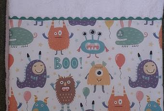 Para él su tía me pidió una toalla con su nombre y decorada con esta bonita tela de monstruitos que me encanta.