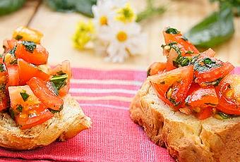 Picaremos muy bien la albahaca. Cortaremos en dados los tomates y uniremos estos con la albahaca picada. Salpimentaremos. Tostaremos las rebanadas de pan y en caliente las frotaremos, por ambos lados, con el ajo. Colocaremos el tomate aliñado con la albahaca sobre el pan tostado.
