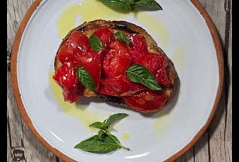 Hoy os traigo un clásico italiano, la bruschetta. Más que un simple aperitivo, la bruschetta es la imagen de la sencillez y el sabor. Su nombre viene de la palabra italiana "bruscare", que significa "asar a la parrilla" o "tostar". Y eso es exactamente lo que es: una rebanada de pan rústico, tostada hasta quedar crujiente, frotada con ajo y bañada en un chorrito de aceite de oliva extra virgen.