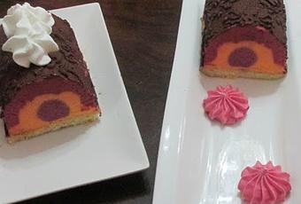 Cortamos una hoja de acetato, del tamaño del molde y se la ponemos dentro, rellenamos el molde, para centros de bûche, y congelamos.