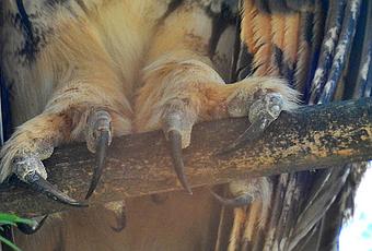 Sus garras son poderosas herramientas de caza. Estas estructuras anatómicas están especialmente adaptadas para proporcionar un fuerte agarre y pueden ejercer una presión considerable al aferrarse a su presa. En la imagen se ven dos orientadas hacia delante y dos hacia atrás. Se ven curvadas y afiladas, lo que le permite agarrar y sujetar a sus presas de manera efectiva. Son muy útiles para atrapar y asegurar pequeños mamíferos, aves, insectos e incluso reptiles.