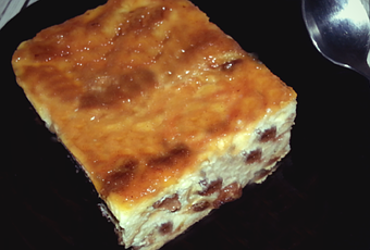 - Partimos los bollos en tiras y cubrimos el fondo del molde con una capa de bollos y luego ponemos una capa de uvas pasas, ponemos otra capa de bollos y así continuamente hasta terminar los ingredientes.