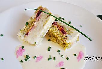 Emplatado: poner un poco de salsa en la base del plato, encima un par de cortes de buding y verter un poco de salsa de queso por encima. Espolvorear con cebollino picado.