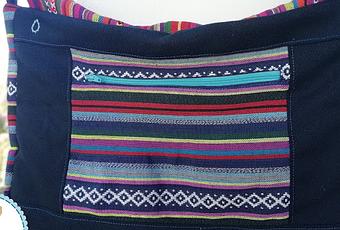 Mi hermana tenía muy claro cómo quería un nuevo bolso para ir cómoda de viaje. Tamaño mediano (el preciso para que quepa un A4 en caso de llevar documentación), asa bandolera, dos bolsillos exteriores con cremallera, dos interiores sin cremallera y cierre del bolso también con cremallera. Igualmente tenía muy claro qué telas quería, y ella misma las compró: básica azul marino más dos alpujarreñas en colores muy alegres. Con todo tan resuelto poco he tenido que pensar, más bien ha sido coser y cantar, bueno, yo cantar poco, las cosas como son.
