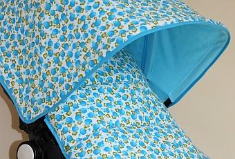 El estampado de manzanas es muy gracioso y llama la atención desde lejos. El interior de la capota es de color azul así como el interior del saco.