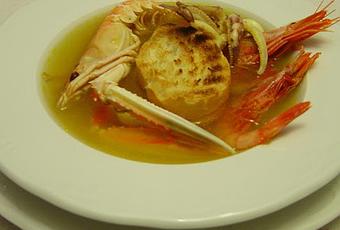 Mientras tanto limpiar los calamares.Cuando el pescado hierva 15 minutos añadimos los calamares, las gambas y las cigalas. Añadimos una picada de azafrán de pelo, cominos y perejil, rectificamos de sal, echamos una pizca de hinojo y hervimos durante 10 minutos más.Apagamos el fuego. Sacamos los calamares a un plato y los cortamos en rodajas y los reservamos junto a las gambas y las cigalas.Colamos el caldo y reservamos.La sopa se sirve hirviendo sobre pan, que ha sido untado con ajo y aceite y tostado en el horno.