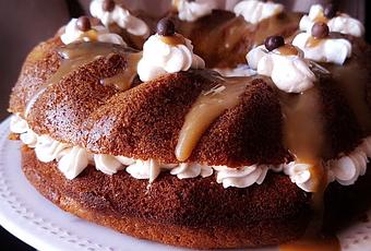 6.- Montamos la nata con el azúcar glas y con la ayuda de las varillas eléctricas. Añadimos el ron y seguimos batiendo.Cortamos el bundt cake por el medio. Ponemos la nata en una manga pastelera. Rellenamos el bundt cake de calabaza con la nata. Cubrimos con la otra mitad del bizcocho. Vertemos el caramelo por encima.Decoramos con un poco de nata y unas bolas de chocolate.