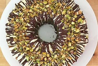 – Una vez frío el bizcocho preparar la cobertura con los chocolates. Yo para ir rápido divido el chocolate en trocitos y lo pongo cada uno en una manga pastelera pequeña, luego al el micro un minuto o hasta que esté fluido, le corto la punta con unas tijeras y hago hilillos con el chocolate por encima del bizcocho. Empezar decorando con el chocolate blanco y luego con el negro y por último, adornar el círculo interior con los pistachos picados.
