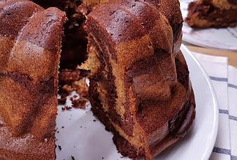 3.- Precalentamos el horno a 180º. Cocinamos la bundt cake marmolada sin huevo ni leche 50 o 60 minutos hasta que estén bien hecha por dentro. Pinchamos con una brocheta, si sale limpia, retiramos el bizcocho del horno. Si sale húmeda, cocimos el bizcocho 5 minutos más. Dejamos que se enfríe fuere del horno y dentro el molde para que no se rompa al desmoldarlo.