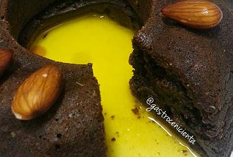 A la hora de servir, emplataremos el bizcocho y sobre el pondremos la salsa de naranja y las almendras crudas, un contraste de sabores que merece la pena probar.