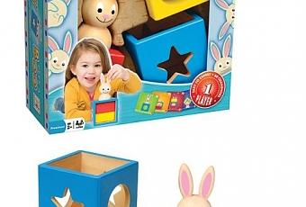 Bunny Boo trae tres piezas de madera de diferentes tamaños y colores y un conejito. Se acompaña de un juego de cartas en las que se muestran diferentes “figuras” que el niño tiene que reproducir. Bunny Boo juega con los conceptos espaciales: delante / detrás, escondido / visible, arriba /abajo.