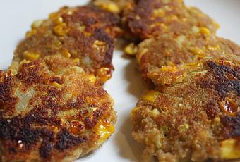 Un bote de maíz dulce (aproximadamente 140 gramos)Medio calabacín medianoUna patata medianaDos dientes de ajoDos cucharaditas de sal marinaMedia taza de pan rallado de espelta, o la cantidad hasta conseguir la consistenciaUna cucharada de AOVEMedia cucharada de aceite de sésamoAOVE para freír