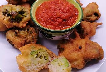 2.- Una vez que la masa este reposada, bañamos cada ramillete de brócoli en la masa. Freímos en abundate aceite caliente hasta que estén dorados por fuera. Una vez estén bien fritos los escurrimos sobre papel absorbente de cocina. Servimos los buñuelos de brócolis con salsa de tomate natural.