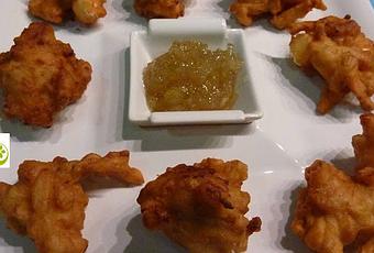 Vamos cogiendo cucharaditas de la masa y las vamos echando en una sartén con aceite de oliva caliente. Dejamos que se doren y sacamos a un papel de cocina. Servimos acompañado de la mermelada de cebolla.