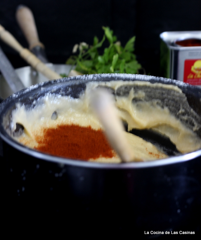 Cuando la masa se separe de las paredes del cazo añade un huevo, remueve con fuerza, al principio te parece que no se unirá, no es así, añade el otro huevo sigue batiendo hasta que esté plenamente incorporado.