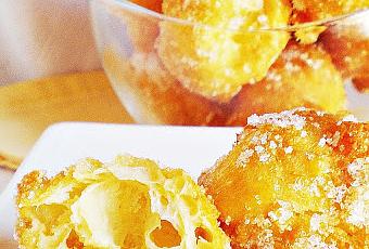 Poner abundante aceite en un cazo o sartén un poco honda e ir añadiendo, cuando el aceite no esté demasiado caliente, pequeñas bolitas de masa hechas con dos cucharillas, una vez hinchadas y doradas, colocarlas encima de papel de cocina, luego pasarlas por azúcar.