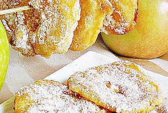 Ingredientes para 4 personas: 4 manzanas Golden pequeñas 1 vaso de los de vino de moscatel 1 huevo 100 gr. de harina 100 cc. de cerveza 1 c/s de azúcar una pizca de sal