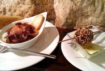 - El 22 Vinos y Tapas. De pinchos sofisticados y algo más caro que otros bares de la zona. Tomamos una brocheta de pulpo (una especie de pulpo en gabardina) y una muy currada tapa de pisto, huevo de codorniz y cecina. Con dos Coca-Colas salió todo por 9,40€