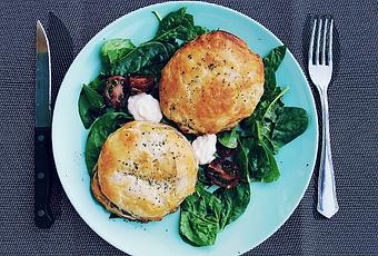 1 lámina de hojaldre2 hamburguesas de polloEspinacasQueso en lonchas cheddarMayonesaTomates Cherry KumatoMantequilla