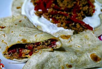 Calentar las tortitas en una sartén sin aceite hasta que estén doraditas por ambos lados. En cada tortita untar yogur griego y colocar encima parte del relleno de atún. Formar el burrito enrollando la tortita sobre si misma y cortar cada tortita por la mitad. Servir inmediatamente.