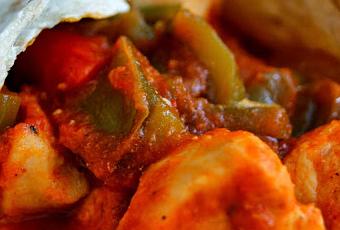 Cortamos los pimientos y la cebolla en paisana grande y salteamos a fuego fuerte. Mientras, cortamos la pechuga también en cubos y la condimentamos con las especies. La agregamos a la sartén.