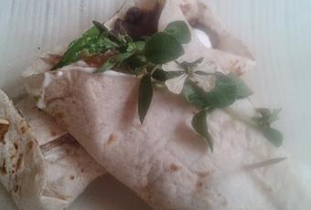 Untar sobre la tortilla, una cucharada de pasta de porotos, agregar la carne salteada con las verduras, queso, una cucharada grande de guacamole y una cucharada de crema ácida o yogur natural.Doblar cilindricamente y servir.