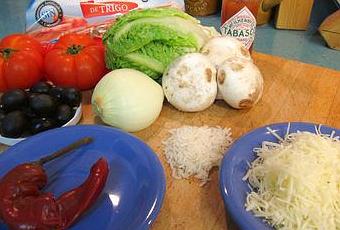 Picamos la cebolla en daditos muy pequeños; la lechuga en tiras largas; las aceitunas en rodajas; el chile en rodajas y luego otra vez por la mitad; los champiñones en láminas y luego por la mitad; y el tomate en daditos.