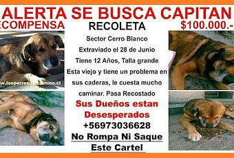 Si por algo siento pena por las personas es cuando se les pierde lo que mas aman, su perro. A pesar de decirles que les tapen los hoyos por donde se salen, que no dejen las puertas abiertas, etc. cuando se les pierde su perro de toda una vida es cuando recién ahí empiezan a saber lo que es sufrir por algo que aman y lo pierden. Pero también hay perros que están abandonados, que viven en un lugar de nuestras calles, quizás a muchos no los busquen, son invisibles para la gente, pero hoy les dejo la triste historia de CAPITAN.BUSCAMOS A CAPITAN...un perro sin dueño, pero no por que no tenga un dueño responsable, nadie se preocupe por el. Existe una mujer que llegó a mí en los comienzos de empezar esta pagina, que conozco hace muchos años, me consta los sacrificios que hace por ayudar a los gatos, y ahora a los perros que siente que también la necesitan. Ella busca a CAPITAN. Capitan vivía en una manada en el sector de la comuna de Recoleta, altura Cerro Blanco y no supo regresar. Es de color café tabaco con tornasol, frisa negra tenue, no tiene máscara su hociquito y pechera blanca.CAPITAN tiene aprox. mas de 12 años de edad, mas una discapacidad auditiva ocular, displacia de caderas, se le traban sus dos patitas traseras en las que se apoya para poder trasladarse a saltos.