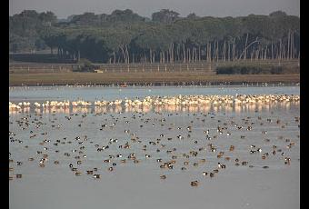 Tras un primer vistazo, pudimos ver que entre las anátidas eran mayoría los Cucharas europeos Anas clypeata. También formaban enormes bandos las Cigüeñuelas Himantopus himantopus, Avocetas Recurvirostra avosetta y los sempiternos Flamencos Phoenicopterus ruber.
