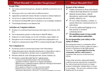 Los "indicadores potenciales de las actividades terroristas", contenida en el folleto no deben interpretarse solo como un signo de actividad terrorista y el documento señala que "sólo porque el discurso de alguien, las acciones, las creencias, la apariencia o forma de vida es diferente, lo hace no significa que él o ella es sospechosa. "Sin embargo, muchas de las actividades descritas en el documento son las prácticas básicas de cualquier persona interesada en línea con la seguridad o privacidad. El uso de PGP, VPN, Tor o cualquiera de las tecnologías de muchos otros para el anonimato y la privacidad en línea están directamente dirigidos por el volante, que se distribuye a las empresas en un esfuerzo por fomentar la información sobre estas actividades.