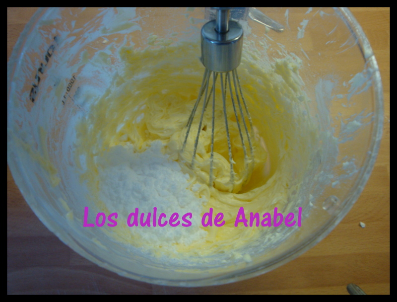 Batimos la mantequilla con unas varillas eléctricas para formar una crema homogénea e incorporamos el azúcar glass sin dejar de batir (si a este crema le añadimos una cucharada de aroma de vainilla obtendríamos una buttercream de vainilla tal y como tenéis publicada en el blog)