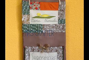 Hace unos días los propietarios de la Casa Rural Doña Manuela, en Valdemierque, Salamanca, pasaron por "Perendengues". Habían visto un tapiz/buzón de sugerencias que hice para otra casa rural, y querían algo similar para su establecimiento.Querían tonos marrones, así que, basándome en el mismo, les preparé este tapiz que ya luce en su casa como buzón de sugerencias.En la parte de abjo, un gran bolsillo doble donde colocar tarjetas, folletos...., y arriba, su logo bordado con técnicas de stitchery aplicación con festón. Como soporte, percha patinada y unas pinzas muy vintage.