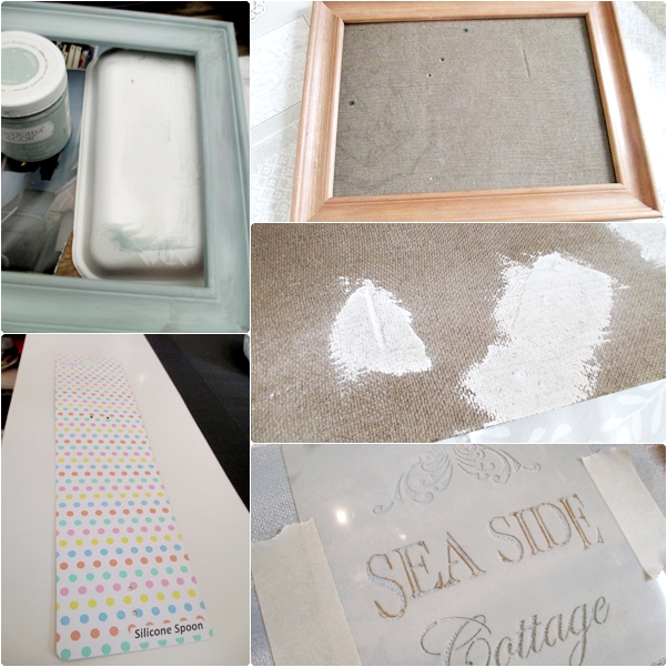 El marco lo pinté en un tono azul verdoso y apliqué una plantilla de Momentos Vintage.Más tarde, un lijado intenso para romper la pintura.