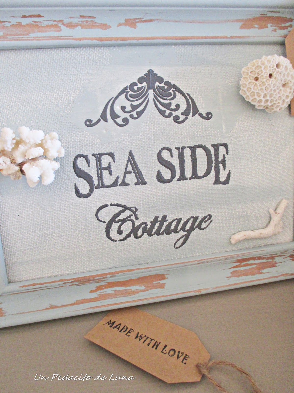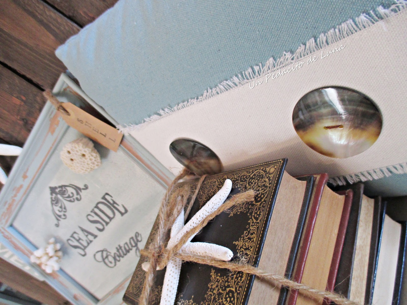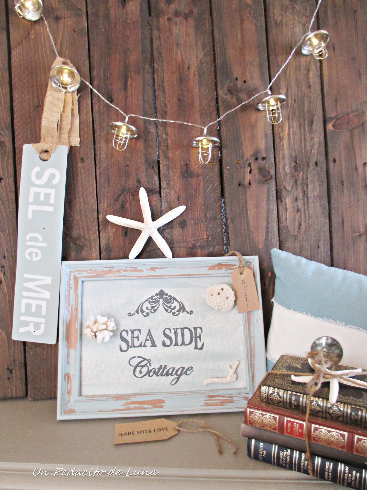 Con una etiqueta XL de cartón (creo que me vino con una varilla de cocina), hice también un estarcido marinero para acompañar al conjunto que, termina completándose con unos farolillos coastal encontrados en un almacén irlandés...