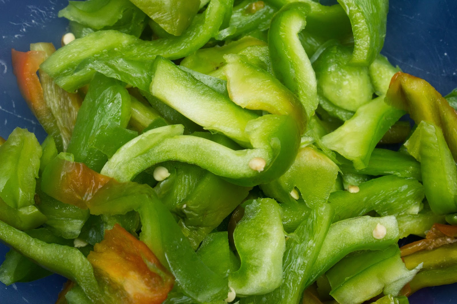 Haz lo mismo con los pimientos verdes pero cortándolos en tiritas.