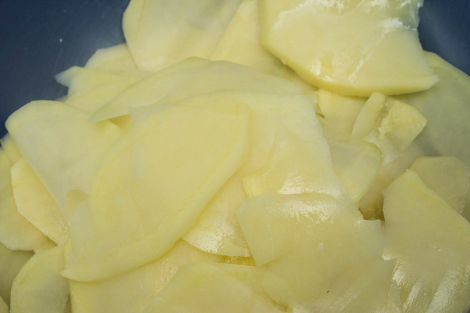 Elaboración:Corta las patatas el láminas finitas y las colocas en un bol.