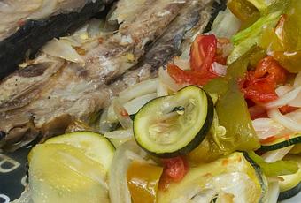 Ingredientes:patatascalabacínpimientoscebollatomateslimónfiletes de caballaalbariño