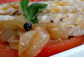 Y tan sólo nos queda desespinar el pescado, si no lo hemos hecho antes, juntar la salsa con el pescado y dejar enfriar. Cuando esté frío lo guardaremos en el frigorífico, pero cuando vayamos a comerlas deben estar atemperadas o incluso algo tibias. El mejor sabor lo cogen al segundo día de estar hechas. Para emplatarlas he cortado unas finas rodajas de tomate y he puesto media caballa encima junto a un poco de cebolla y pimienta y he salseado ligeramente.