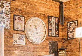 La cabana tiene interiores muy calidos, de madera natural en paredes , y pintada en techo y piso. El aire es muy anos '50, con cierto toque americano, por los accesorios y detalles de epoca. F.