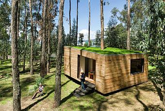 La vivienda esta construida en madera y techo verde, en medio de un bosque de eucalipto