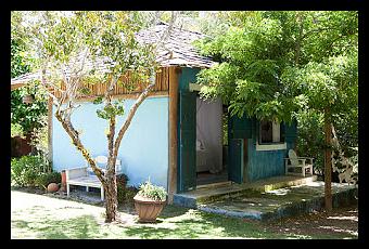 La pequeña vivienda, construida en madera, esta pintada de colores celestes y verdes esmeraldas, con interiores muy blancos y practicos.