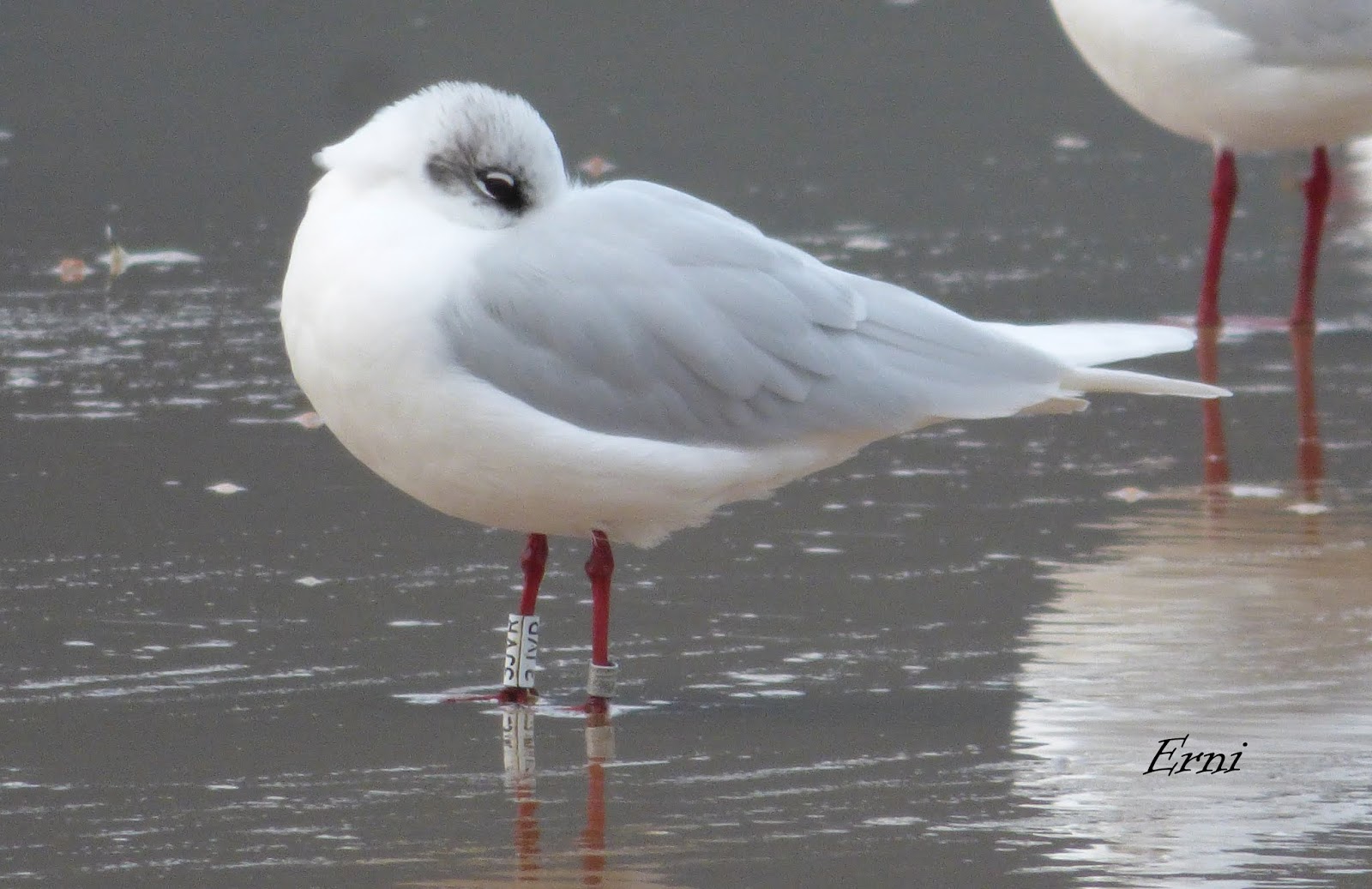 El arenal de la Salvé en Laredo es un buen lugar para observar gaviotas y tratar de descubrir alguna anillada. El día 14 de enero me entretuve con ellas y descubrí, además de 2 simpáticas gaviotas canas, 7 cabecinegras anilladas y una patiamarilla vasca. Una era polaca y estoy a la espera de su historial... el resto de cabecinegras belgas y francesas.